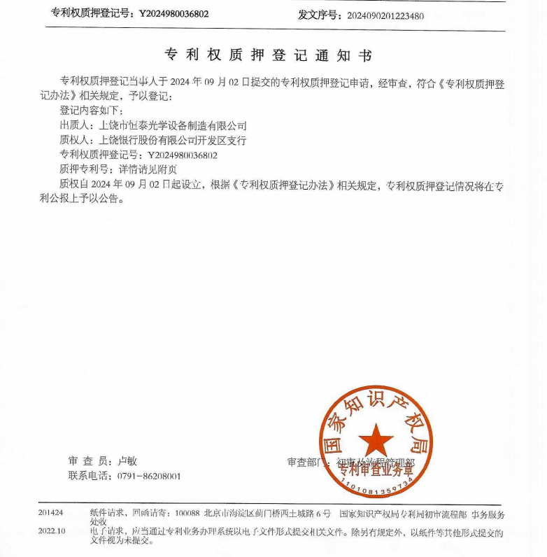 喜报:上饶市恒泰光学设备制造有限公司质押融资已放款2000万