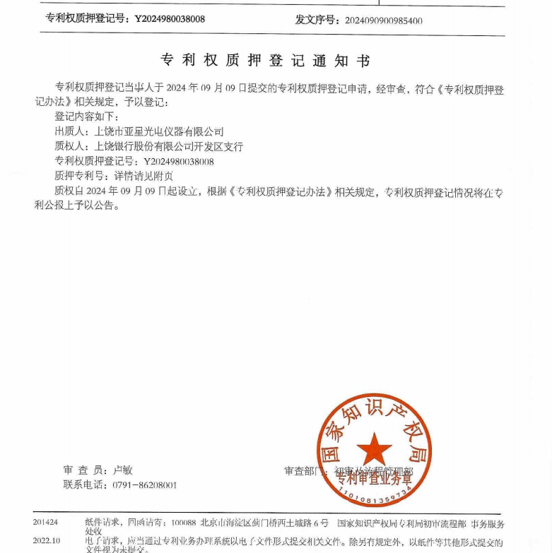 喜报:上饶市亚星光电仪器有限公司质押融资已放款1000万