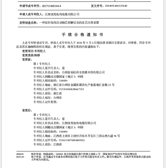台州金福桂再生资源利用有限公司达成专利转让合作,并已成功转让。
