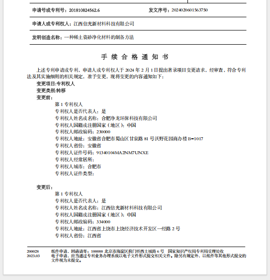 江西信光新材料科技有限公司通过上饶市知识产权第三方转移转化运营平台知识产权服务专区发布的专利转化信息已成功与合肥净龙环保科技有限公司达成专利转让合作,并已成功转让。