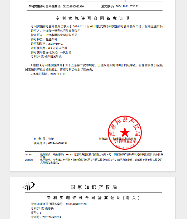 上饶市源诚光学有限公司通过上饶市知识产权第三方转移转化运营平台知识产权服务专区发布的专利转化信息已成功与上饶市一鸣光电有限责任公司达成专利许可合作,并已成功许可。